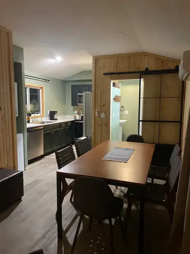 Orchard View is a small cabin designed with a family in mind. The front porch boasts a beautiful Ozark mountain view. Grab your fishing pole and walk the path that descends through the orchard of various fruit trees to the pond below. The stocked pond is home to catfish, bass, brim, and Grass carp. You could also step onto the back porch and sit under the shade of a large Arkansas Black Walnut tree. Let the private sauna heat to temperature and step inside to allow your body to unwind. In the evening, after winding down by the fire, the kids can hop into one of the bunk beds made from 100 year old barn wood. There is a full kitchen and a gas grill for those that want to stay on site for dinner.
